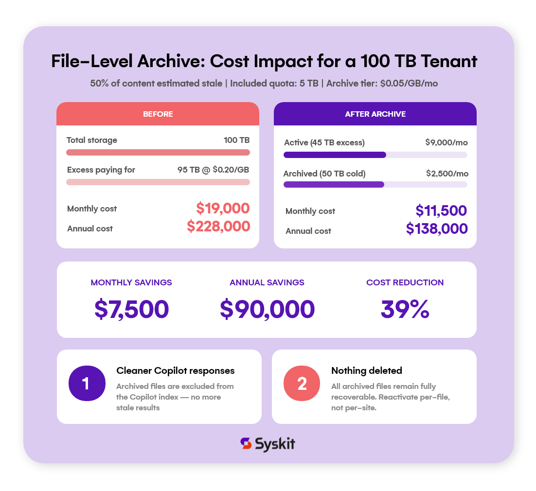 File-level archive delivers a direct cost benefit: organizations paying for extra SharePoint storage at $0.20/GB/month can move stale files to cold storage at $0.05/GB/month — a 75% reduction on what is often 30–50% of their total content.