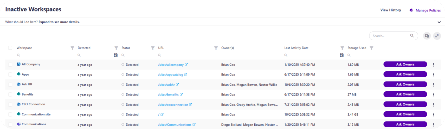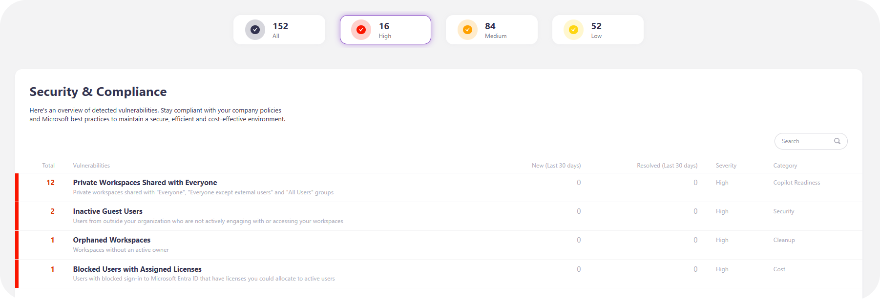 You’ll receive instant granular alerts about unlabeled workspaces, security and compliance vulnerabilities, the number of inactive M365 licenses at your disposal, and more.