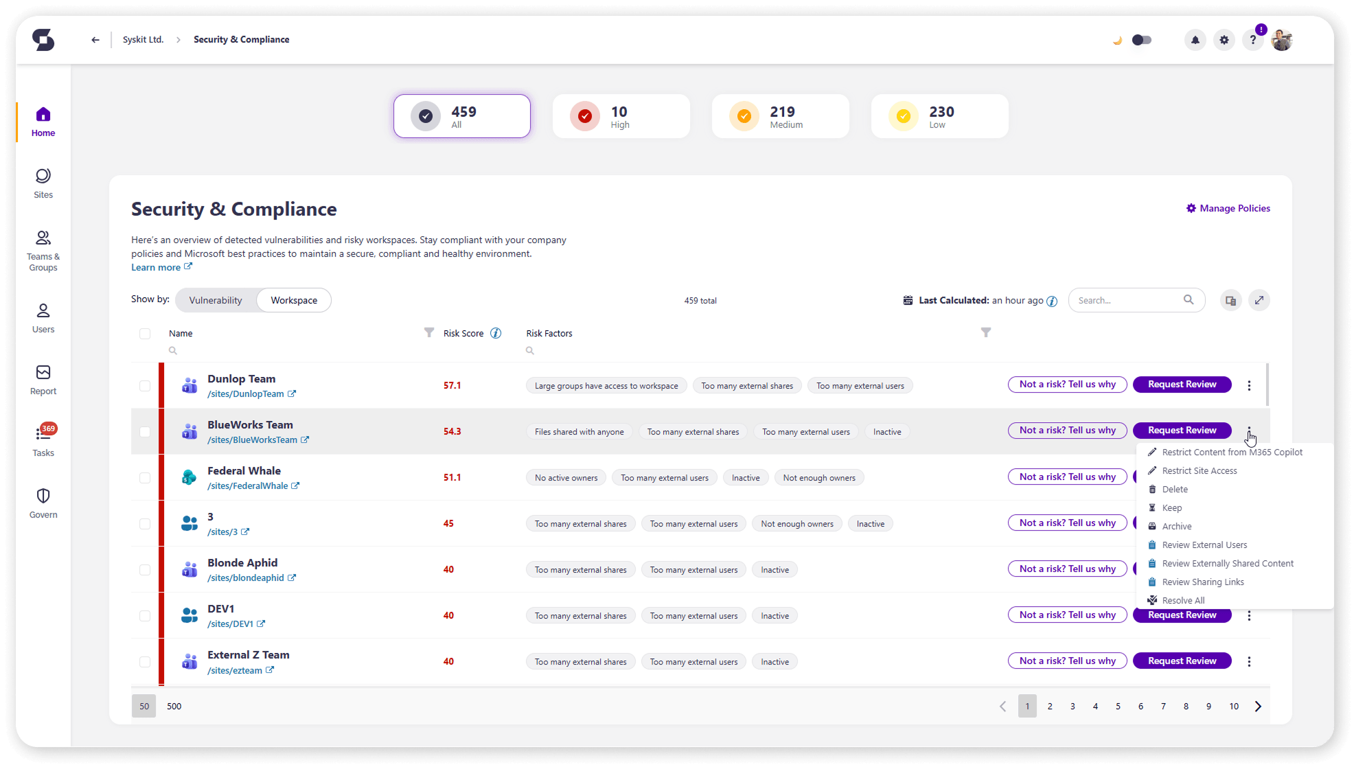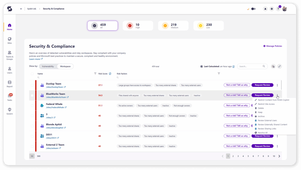 A guided resolving wizard is now available directly from the Risky Workspaces report. Admins can resolve risks themselves, or workspace owners can be brought directly into the resolution process, reducing the dependency on central IT.